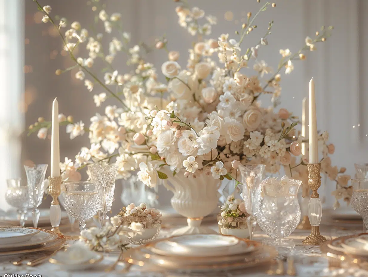 - Thème vintage : Optez pour des éléments de décoration rétro, comme des chandeliers en laiton, des vaisselles chinées et des napperons en dentelle. Les couleurs pastel et les fleurs séchées se marient parfaitement avec ce style.